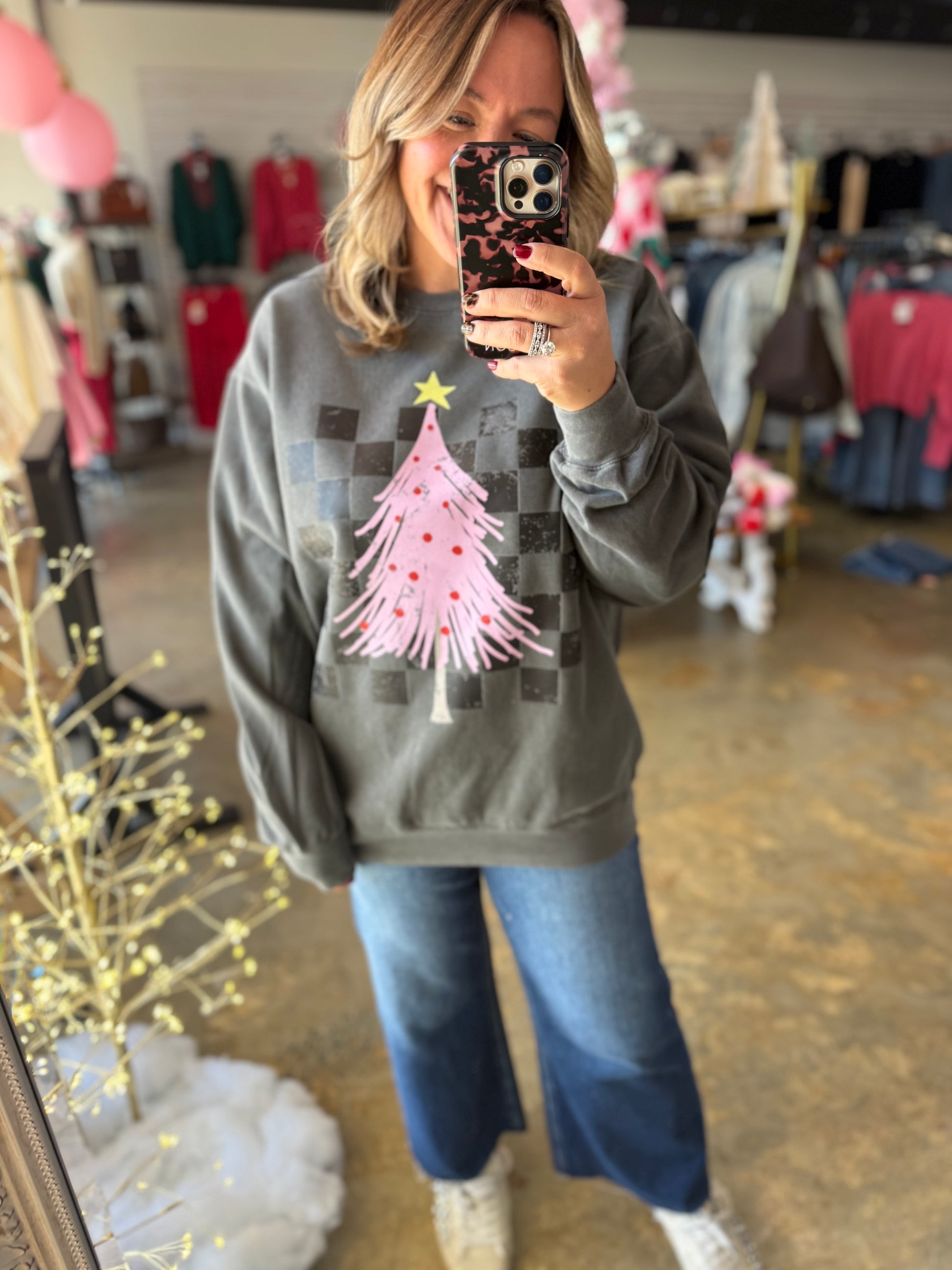 Stay merry and modern in our Checkered Christmas Crew. This premium Comfort Colors sweatshirt pairs classic comfort with a trendy twist — a pink Christmas tree set against a black checkered design. The washed grey tone gives it that lived-in, cozy vibe you love while keeping things fun and festive. Perfect for all your holiday outings (and lounging days too).