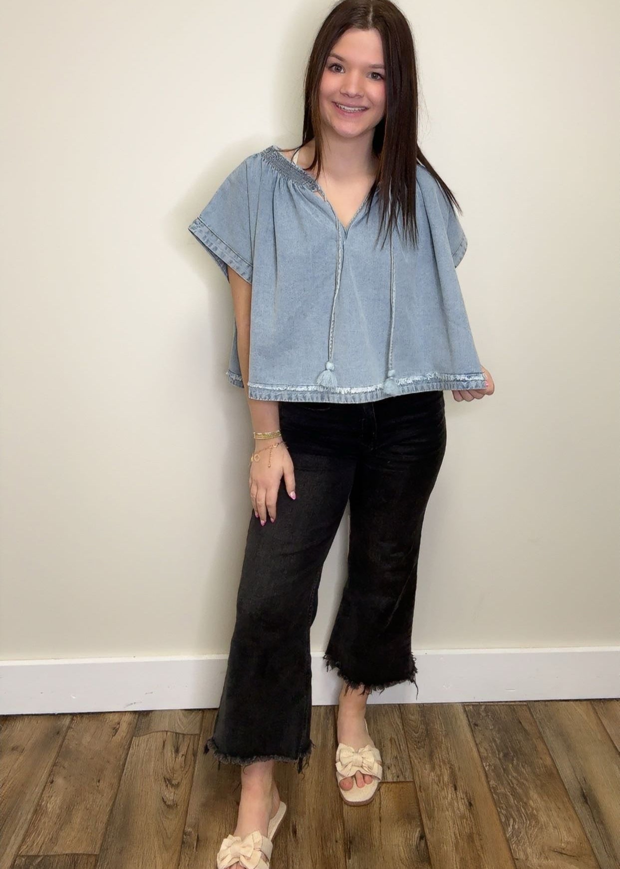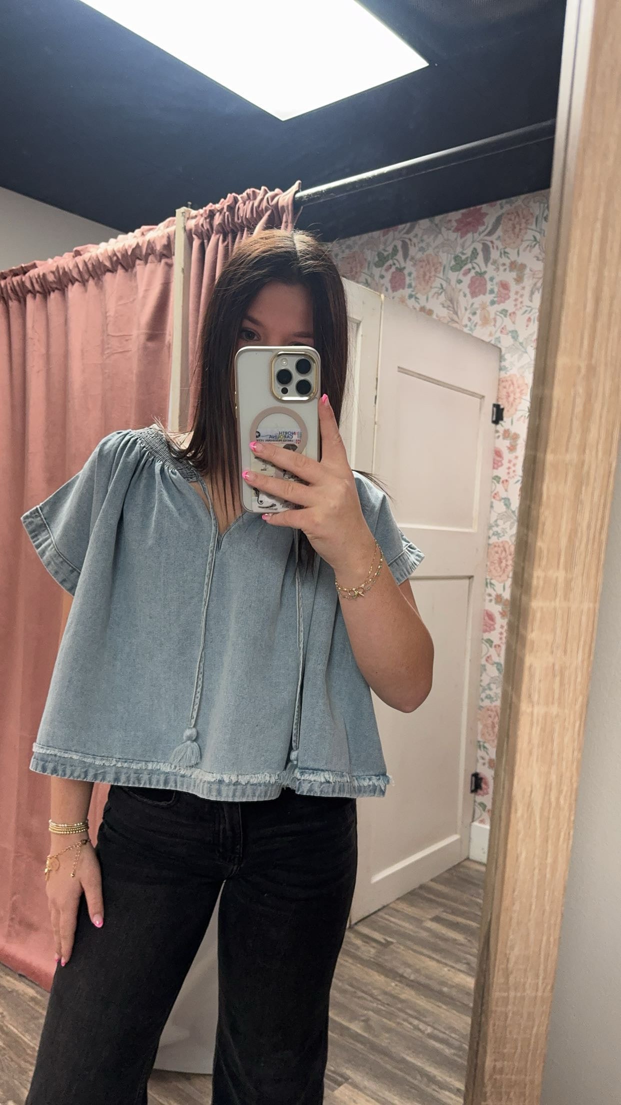 The Smocked Neck Dolman Chambray Denim Blouse Top offers a stylish blend of comfort and sophistication. Its lightweight chambray denim and smocked neckline add texture and refinement, while the relaxed dolman sleeves create a breezy silhouette. Perfect for warm days or layering, this versatile top effortlessly pairs with any bottom for a casual or semi-dressy look.