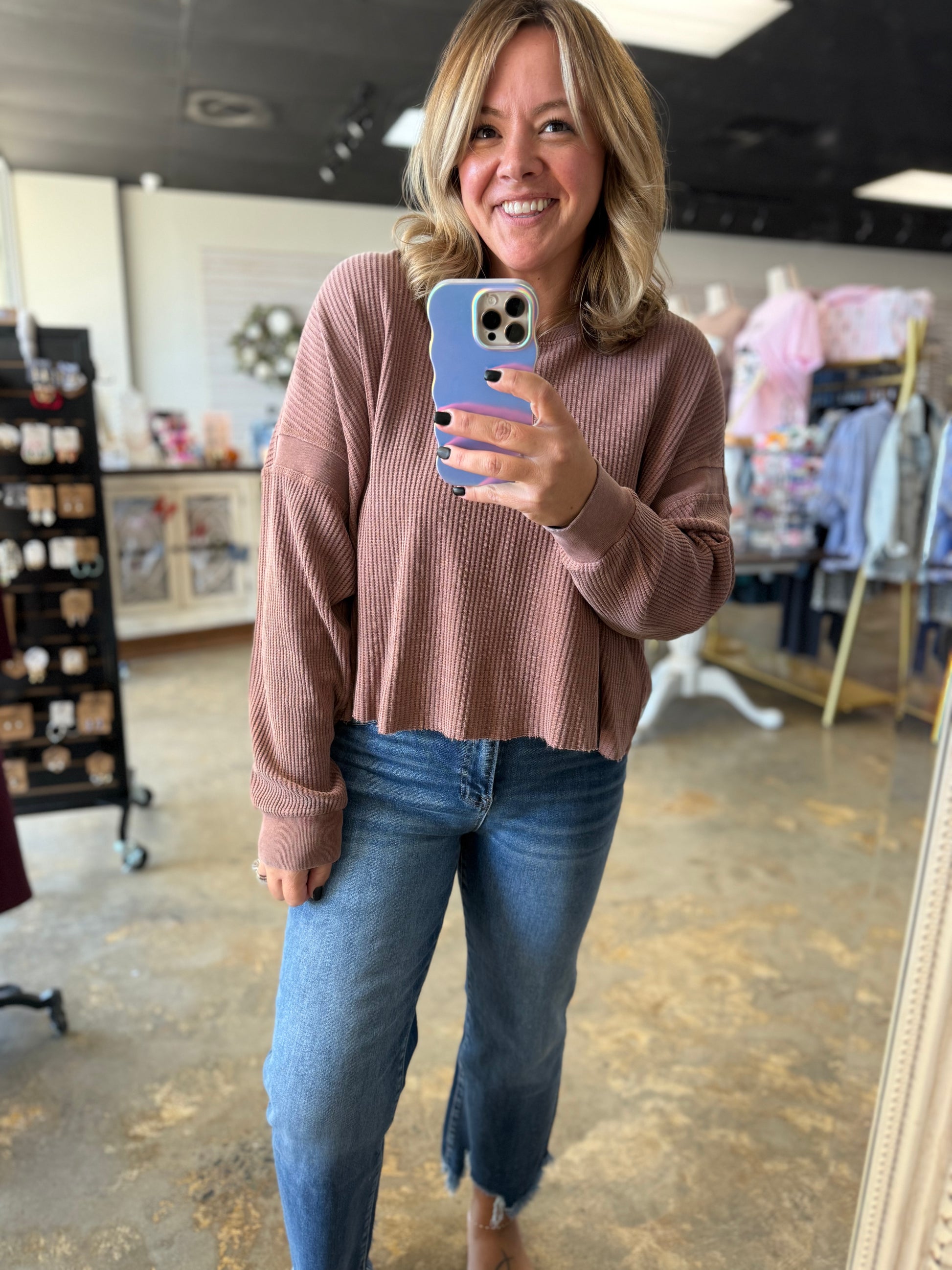 Add a twist to your basics with our Open Back Textured Knit Long Sleeve Top. The cozy knit hugs you just right, while the playful open back detail keeps things flirty and fresh. Perfect for layering or wearing on its own, this top brings texture and charm to any outfit. Whether you’re out with friends or just lounging, stay comfy and stylish with a peek of unexpected fun.