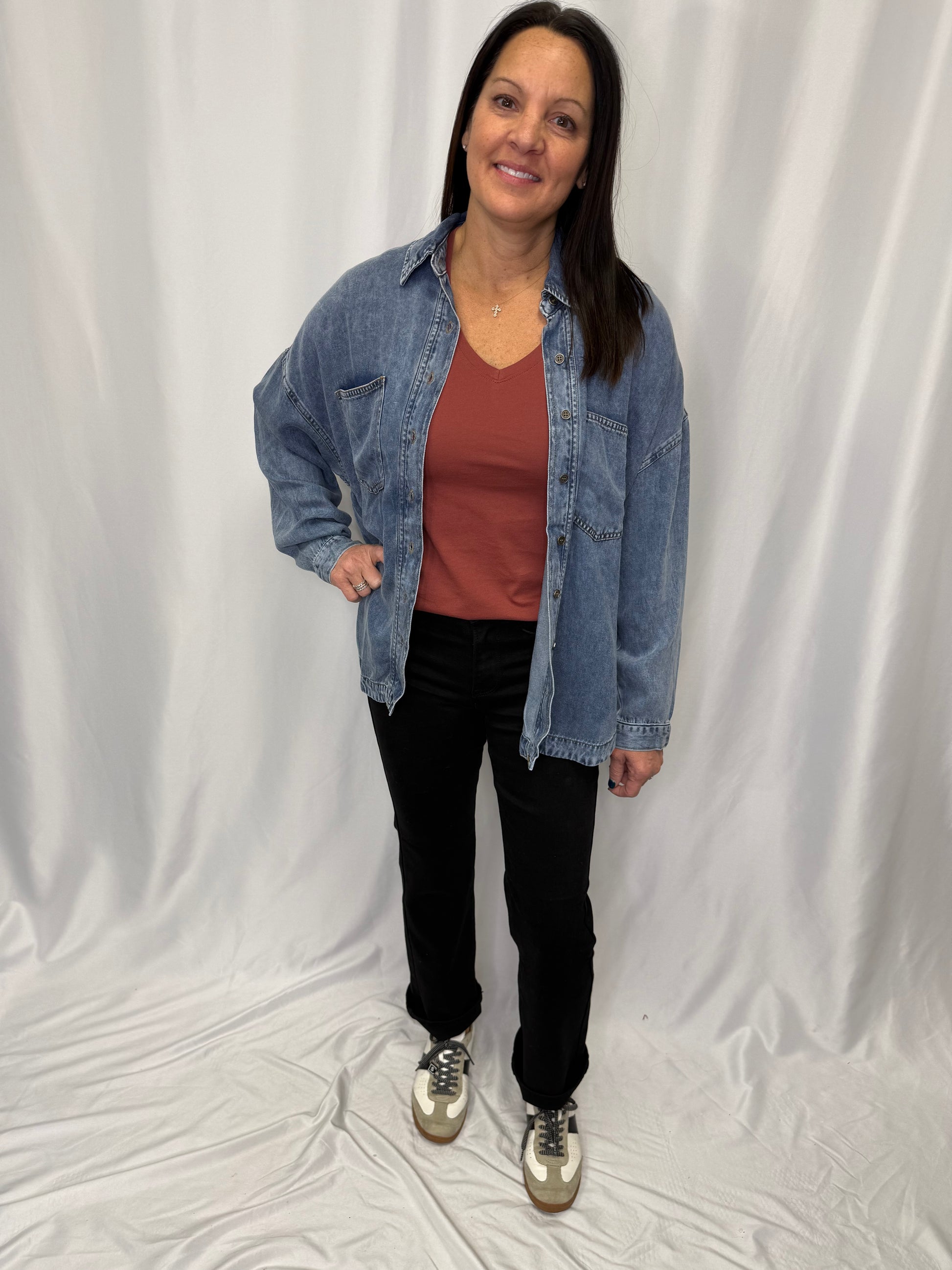 Effortless style meets comfort in this washed chambray button-down that's ready for anything. The soft, lived-in fabric drapes beautifully while the classic collar and full button front keep things polished. Layer it over a tee, tie it at the waist, or wear it solo—this versatile piece transitions seamlessly from casual weekends to relaxed workdays. A Southern wardrobe essential that only gets better with wear.